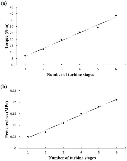Torque and pressure loss results of 1–6 turbine stages. (a) torque results; (b) pressure loss results.