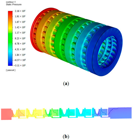 Pressure contour of six turbine stages. (a) overview of the pressure distribution within six turbine stages; (b) cross-sectional view of the pressure distribution within six turbine stages.