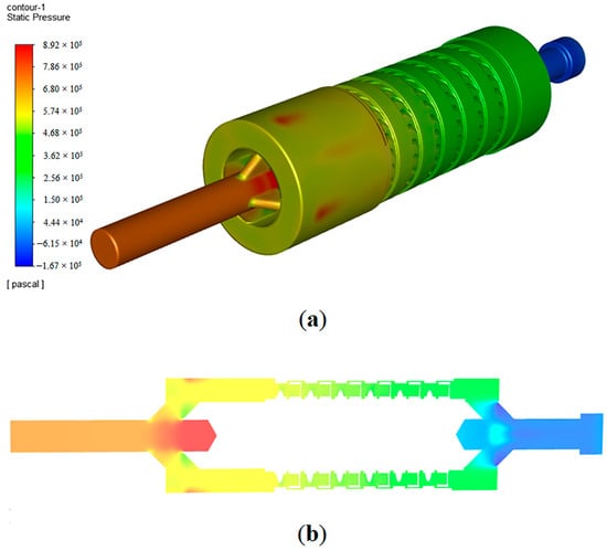 Pressure contour of a DFDR whole set: (a) overview of the pressure distribution within a DFDR whole set; (b) cross-sectional view of the pressure distribution within a DFDR whole set.