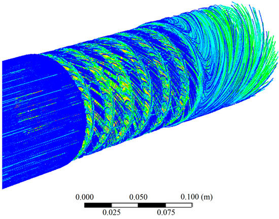 From CFD analysis results, it is known that three major pressure loss areas exist within each DFDR: the inlet area (0.18 MPa), the turbine stages area (0.22 MPa), and the outlet area (0.31 MPa). It is interesting to find that although the upper and lower groups of inclined holes are of the same cross-sectional area, number of holes, and angle of inclination, the pressure losses of the two areas are obviously different, with the pressure loss of the inlet area being significantly less than that of the outlet area. From the streamline trajectory of the six turbine stages shown in Figure 11, we can see that the streamlines behind the turbine stages are highly chaotic, which is indicative of turbulence and eddies that exert resistance to the fluid flow. This phenomenon causes a greater pressure drop in the outlet area.