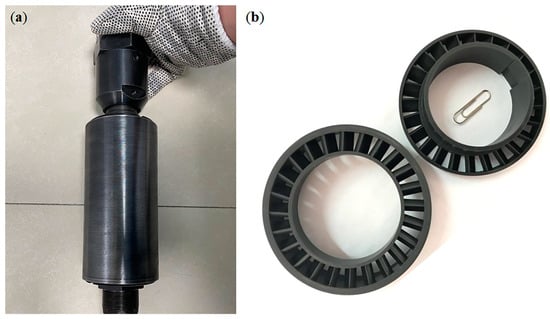 Based on the simulation results, modifications were made to the design of the inclined holes. The axial length of the cross section of each hole was elongated to increase the cross-sectional area; the angle of inclination of each hole was reduced, and one more hole was added within each group. The concave structures on both sides of the shaft were removed. As discussed previously, these modifications aim to reduce the pressure loss at the inclined hole areas and preserve the pressure energy for the turbines. The simulation results show that these modifications reduce the pressure loss of a single DFDR by 18.31% (0.58 MPa). As described in the previous sections, the increase in the length of the shaft and the corresponding increase in the number of turbine stages can proportionally increase the torque output of a single DFDR. Meanwhile, the current six-stage DFDRs axial length can still be significantly increased to incorporate more turbine stages while still satisfying the general requirement for the curvature radius of the URHW. However, as the target formations in the field trial area are very close to those of old wellbores, and thus the current flexible drilling assembly corresponds to a 3–5 m curvature radius, it was decided that the current shaft length should not be modified to conform to the situation at the field trial spots. The model machines were then produced (as shown in Figure 12).