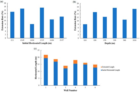 Results for DFDR-based field trials. (a) Extension Rate vs. Initial Horizontal Length; (b) Extension Rate vs. Depth; (c) extended length of each URHW.
