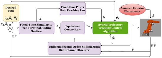 The RMs can be controlled with a variety of control strategies, such as computed torque control (CTC) [1], PID [2], sliding mode control (SMC) [3,4], adaptive control (AC) [5], soft computing-based SMC [6], etc, to improve their performance, reliability, and safety. SMC has gained considerable attention for addressing these disturbing factors and achieving purposes of perturbation attenuation. Asymptotic stability of the control system can only be achieved with conventional SMC regulations for RMs based on linear sliding surface (LSS), whereas achieving high-accuracy tracking control within a finite-time frame is necessary. Due to parasitic dynamics and the time delay of switching control law, undesirable chattering will happen in the sliding stage of the SMC. As a result of these problems, the use of a large sliding value will lead to severe chattering. Chattering can be attenuated using several methods, including boundary layer technique (BLT) [4], high-order SMC (HOSMC) [7], continuous approximations (neural network (NN) [8] or fuzzy logic system (FLS) [9]), and modified reaching laws [10,11]. One effective reaching law for attenuating chattering is the power rate reaching law (PRRL) since the discontinuous term is wholly removed. Consequently, the SMC based on the PRRL has gained great attention since its introduction.