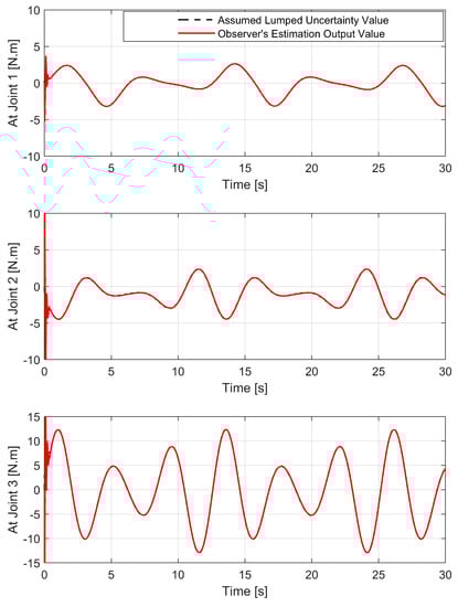 To evaluate the estimation ability of the observer, the efficiency, and the robustness of the proposed controller, we assume that there are effects of uncertain factors on the robot, such as external disturbances and interior frictions. Each joint has assumed interior friction of F f 1 ( θ . )   =   0.1 sign ( θ . 1 )   +   2 θ . 1 [ N · m ] , F f 2 ( θ . )   =   0.1 sign ( θ . 2 )   +   2 θ . 2 [ N · m ] , and F f 3 ( θ . )   =   0.1 sign ( θ . 3 )   +   2 θ . 3 [ N · m ] , respectively. Each joint has assumed exterior disturbance of δ 1   =   4 sin ( t ) [ N · m ] , δ 2   =   5 sin ( t ) [ N · m ] , and δ 3   =   6 sin ( t ) [ N · m ] .