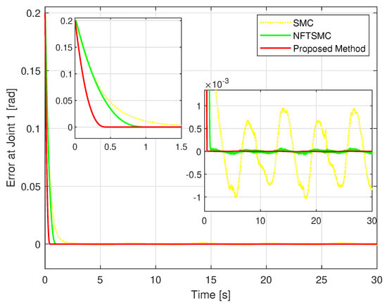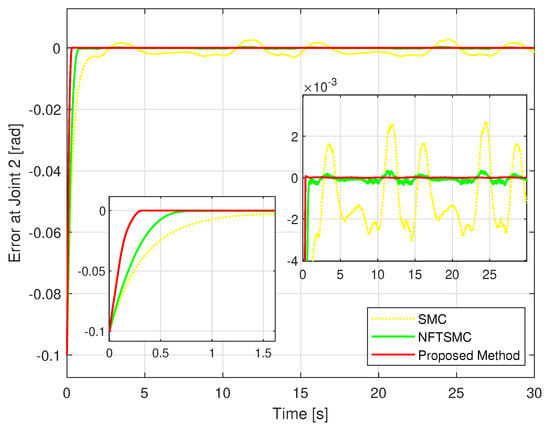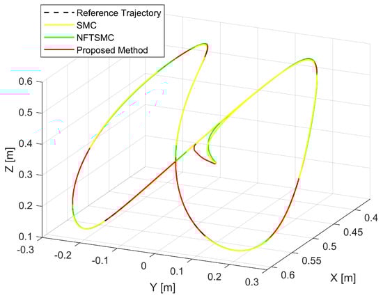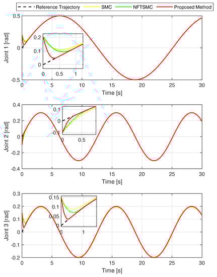 Figure 5 shows the real trajectory of the robot’s end-effector compared to the desired trajectory. Figure 6 depicts the real trajectory positions of the robot joint generated by three different methods compared to the desired path. Each method can be successfully used to control the robot to track its desired path. Figure 7, Figure 8 and Figure 9 show, respectively, the TCEs at each joint between the real trajectory position and the desired path. Looking at Figure 7, Figure 8 and Figure 9 and comparing the results in Table 3, the suggested control synthesis proves its superiority in trajectory tracking problems when minimizing the smallest TCEs among the three controllers. The NFTSMC [40] is a recent modern control method, so it also achieved relatively high tracking accuracy, its accuracy is higher than the conventional SMC.