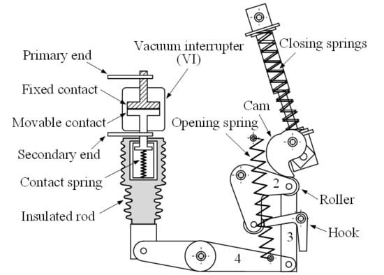 A medium-voltage VCB is composed of two components: the vacuum interrupter (VI) and the operating mechanism. The operating mechanism was designed for opening and closing the electric contacts in the VI. In the VI, the electric movable contact and fixed contact were installed in a ceramic insulator envelope wherein high vacuum approximately Pa was maintained. The employed operating mechanism in the present study was a spring-actuated cam-linkage composite mechanism, and the main constituent parts are illustrated in Figure 1 and Figure 2, comprising a cam and follower mechanism, a four-bar linkage, a hook, an insulated rod, and three different springs (closing spring, opening spring, and contact spring). The movable contact for each of three phases was connected to the operating mechanism through an insulated rod and contact spring (also called a wipe spring). Figure 1 and Figure 2 illustrate the basic configurations of the VCB operating mechanism in its opened state and closed state, respectively. In the closed state, the electric system was normally operational because the movable contact engaged with the fixed contact, and the current was connected between the primary and secondary ends; however, in the opened state, the electric current was interrupted because the movable contact separated from the fixed contact.