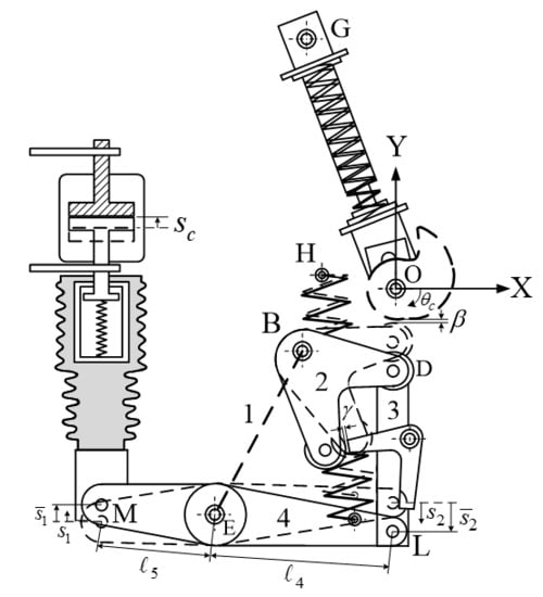 As depicted in the FBD of the output link LM connected to the insulated rod and movable contact (Figure 16c), the moment exerted on the main shaft E of the output link, referred to as the driving moment (), originated in two closing springs, and the resistant moment (), originated in the opening spring, three contact springs, and atmospheric pressure force. The driving moment and resistance moment are expressed as follows: