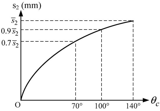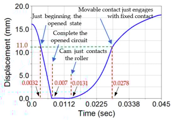 Figure 3 illustrates the status of the cam-linkage composite operating mechanism of the VCB when switching from the opened state (indicated by a dashed line) to the closed state. During cam rotation with high angular velocity, the roller followers continuously make contact with the cam, thereby preventing adverse dynamic responses. As illustrated in Figure 3, denotes the rotation angle of the cam, and (both in the positive direction with the increase in ) represent the vertical displacement of points L and M on the output link of the four-bar linkage, respectively. At , the point L moved to the lowest position of the motion, where the overall vertical displacement was . Concurrently, point M moved an overall vertical distance of while the movable contact moved a contact stroke . Subsequently, the hook latched onto the follower link BD and prevented the opening spring from retracting the link. Within a complete revolution of the cam, the rotation angle required for the cam to effectively contact the roller and complete the closing operation was less than 180°, and the contact between the cam and the roller should be prevented in the remainder cam rotation angle. The vertical displacement () of point L exhibited a nonlinear relationship with the rotation angle of the cam () during the closing operation. The nonlinear motion relationship between and is illustrated in Figure 4 and depends on the characteristics of the CB, displacement range of the insulated rod, and the required average velocity of the movable contact (1.5 ± 0.2 m/s for the opening operation; 0.9 ± 0.2 m/s for the closing operation). The motion relation was specified using the cam rotation angle at 0°, 70°, 100°, and 140°, the corresponding vertical displacements of point L were and , respectively, and the corresponding rotation angles of the output link LE of the four-bar linkage were , and respectively; is the overall angular displacement of the output link 4. The motion relationship was similar to that between the motion of the roller follower and the cam.