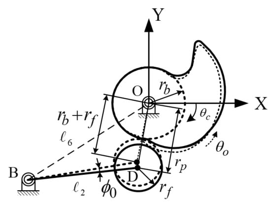 Step 8. In the initial default position of the cam, a clearance is retained between the cam and roller follower to prevent the roller from colliding with the cam at the instant of the operating mechanism to restore its default position. Therefore, at the initial default position the distance between the centers of cam and roller is . Subsequently, the cam must be rotated counter clockwise with a small angle , covering a distance of relative to the roller. Therefore, the actual rotation angle of the cam, , in the operating mechanism is . When , according to the geometric association illustrated in Figure 7, the initial angular position of the follower link BD () is determined as follows:
