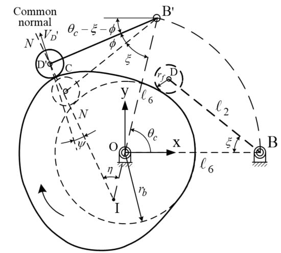 As displayed in Figure 8, the intersection point, I, between the common normal of the contact surfaces and the lines joining the two rotation axes, is the instantaneous center of the follower motion relative to the cam, and can be determined using trigonometry.