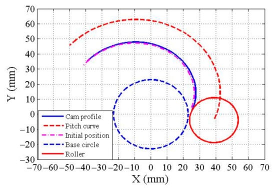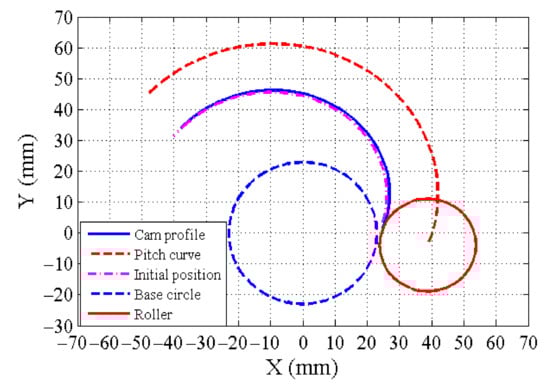 Step 10. According to Figure 8, the coordinates of the pitch curve of the cam is determined using the following equations []