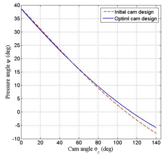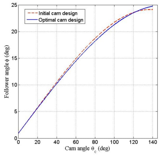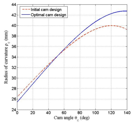 According to Equations (5) to (8), the four coefficients of the three-order polynomial displacement curve of the follower were determined as follows: 0.015185, 0.240347, 0.011694, 0.017243. Figure 10, Figure 11, Figure 12 and Figure 13 illustrate the results of kinematic analysis of the initial cam design. Figure 10 only displays the portions of the pitch curves and the cam profile that make continuous contact with the roller. Figure 11 (red dashed line) illustrates the angular displacement curve of the oscillating follower. Figure 12 (red dashed line) displays the pressure angle of the cam mechanism; the maximum pressure angle was less than the allowable maximum pressure angle of 45°. Figure 13 (red dashed line) depicts the radii of curvature of the cam profiles that are greater than the radius of the roller (15 mm), that is, indicating that no undercutting occurred on the cam profile. Thus, if considering only the curvature of cam profile, the initial cam design was feasible. For reducing the number of figures and facilitating the comparison between the initial cam design and optimal cam design discussed in Section 4, the relevant analyses curves (blue solid line in Figure 11, Figure 12 and Figure 13) of the optimized cam mechanism were included into the figures of the analyses of initial design.