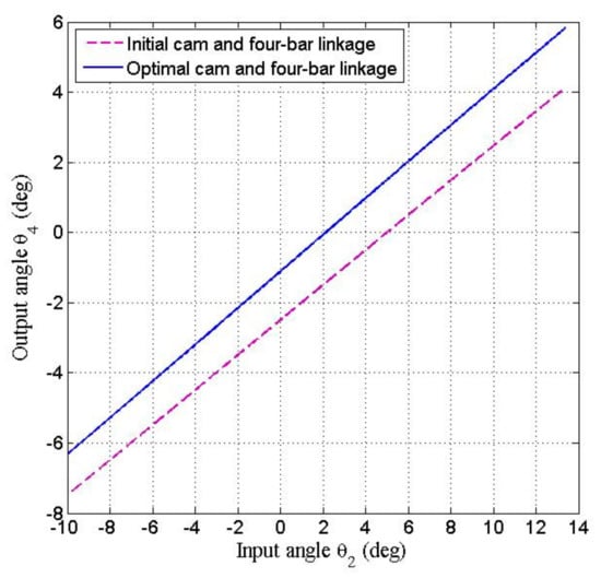 Figure 14 (red dashed line) displays the displacement function curve of point L. Both red dashed lines in Figure 10 and Figure 14 depict similar motion relationships. The relationship between the output and input angles of the four-bar linkage was approximately linear, as illustrated by red dashed line in Figure 15.