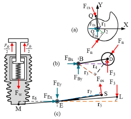 where is the increased deformation of the contact spring during the period of closing operation, the vacuum force due to the atmospheric pressure (referred to as the free-contact force, ) between the two contacts was 160 N, indicating that the pressure applied to the movable contact was equal to the difference between the atmospheric pressure and the pressure of the VI. The free-contact force was equal to zero once the electric movable and fixed contacts were engaged. Figure 16 displays the free-body diagrams (FBDs) of various parts in VCB operating mechanism during the closing operation. The FBDs represent the cam (Figure 16a), roller and follower link (Figure 16b), and the output link connected with the insulated rod and movable contact (Figure 16c), respectively.