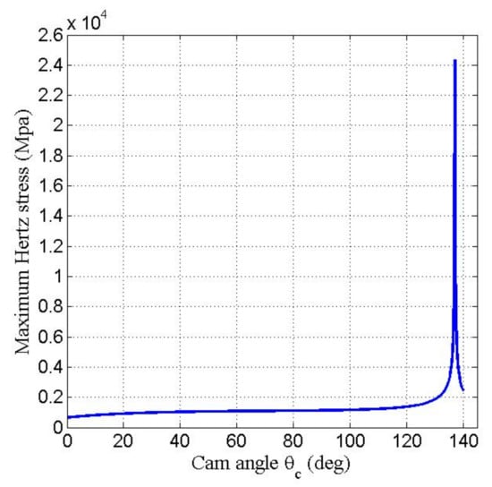 where and denote the elastic modulus of the cam and roller, respectively; and denote Poisson’s ratios of the cam and roller, respectively. The maximum Hertz contact stress () is generated at the center of the contact surface between the cam and the roller follower and can be expressed as follows: