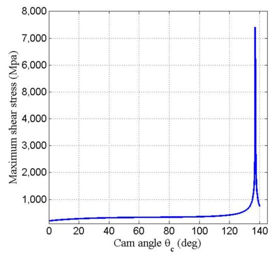 The radius of curvature of the cam profile is crucial for calculating the Hertz contact stress between the contact surfaces of the cam and roller follower. The Hertz contact stress was evaluated to determine whether the contact stress and the shear stress of the cam surface were lower than the endurance contact stress and yielding shear stress, respectively.