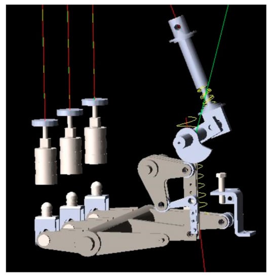 To simplify the dynamic analysis, the following assumptions were considered: The main constituent parts of the operating mechanism, as illustrated in Figure 1 and Figure 2, were considered rigid bodies. The weight of each part and the effects of friction on the joints were considered negligible compared with the dynamic forces acting on the parts. The closing springs, opening spring, and contact spring were linear springs. As displayed in Figure 9, the spring coefficients of two closing springs were N/mm and N/mm, and their pre-compression lengths were 140 and 100 mm, respectively. The spring force of the closing springs () during the closing process are expressed as follows: