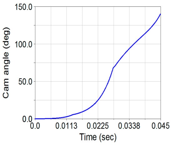Figure 9 displays the schematic of a spring-actuated cam-linkage composite operating mechanism of a VCB during the closing operation. The data and design parameters of the initial design provided by the manufacturing vendor were as follows (Figure 3 and Figure 9). Data of four-bar linkage: = 139.79 mm, = 70 mm, = 124.7 mm, = 140 mm, = 90 mm, = 90.6035 mm, = 105 mm, and = 25 mm; the overall vertical displacement of point M, = 16 mm, the coordinates of fixed pivots were , and and the angle was ; the preset angle was 95°. Data of the cam mechanism: radius of base circle of the cam was mm, radius of the roller follower was mm, loss coefficient of the contact was = 0.95, clearance between the roller and hook was = 1 mm, clearance between the cam and roller was = 2 mm, and the default initial rotation angle was . The kinematic analysis of the initial design of the VCB operating mechanism was performed during the closing operation using a MATLAB coded program.