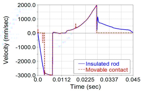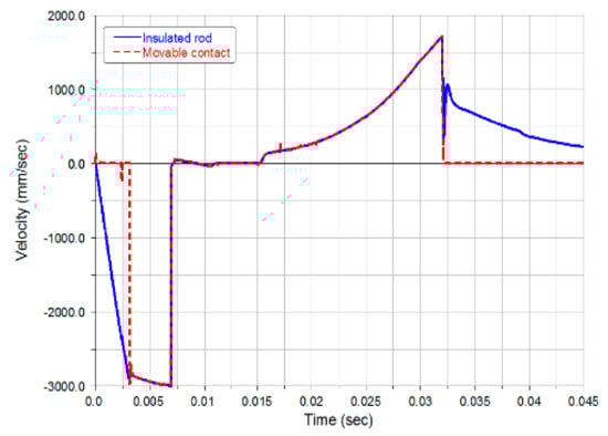 Velocity of movable contact and insulated rod during closing process (Simulated by MSC-ADAMS).