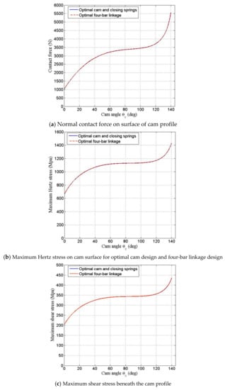 where represent the general output force and general resistant force of the mechanism at the i-th selected angular position of the cam; Ns represents the number of selected angular positions (Ns = 140) of the cam during the closing stroke which the cam makes contact with the follower; h(X) denotes the penalty function; and M is an extremely high number (M = 106).