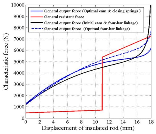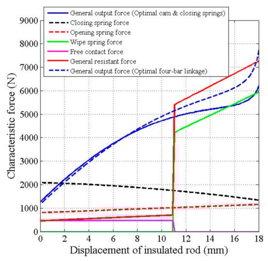 Based on above derived equations, a MATLAB2011 coded program was developed for analyzing the characteristic forces (including spring forces, general output force, and general resistant force), and the displacement of the insulated rod during closing operation in the VCB mechanism. The program was executed using an ASUS-P43E notebook with Intel core I5-2450M 2.5 GHz CPU. The various characteristic forces, including the opening spring force (red dashed line), closing spring force (black dashed line), wipe spring force (solid green line), general resistant force (red line) and general output force (blue dashed line) during the closing operation were displayed in Figure 17. The general output force of the VCB operating mechanism is not always required to be greater than the general resistant force during the closing stroke. The area under curve (AUC) of the general output force represents the integration of the force with respect to the differential displacement of the insulated rod, indicating the output work (also referred to as driving work) in the VCB operating mechanism. Similarly, the AUC of the general resistant force indicates the resistant work in the VCB operating mechanism. This study aimed to minimize the net work done (or referred as surplus output work, equal to the difference of the driving work and the resistant work) for the CVB operating mechanism during the closing operation. Therefore, if the value of Ns was taken large enough, considering that the step increment of insulated rod was differential and constant, the overall differences between the general output forces and the general resistant forces (divided by mechanical efficiency) at the selected sequence positions of the insulated rod during the closing operation was considered as the objective function to be minimized, as discussed in Section 4.