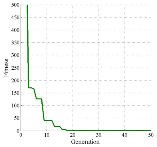 Table 5 displays the parameter settings for the optimal VCB mechanism design. This study employed the DE-gr method, which involved using a specified proportion of the crossover rate to the mutation factor, referred to as a golden ratio (0.618:0.382) []. Twenty-five numerical experiments were performed to obtain the best optimal solution, and each experiment had 300 generations. Table 6 lists the optimal results, indicating that the minimum value of objective function was 1.74 × 10−7. Figure 28 displays the convergence rate of the optimization process, which rapidly converged to the optimal value in the 43rd generation. Figure 29 and Figure 30 illustrate the dynamic analyses of the optimal VCB mechanism during the closing operation, performed using a MATLAB-coded program. Figure 29 displays the optimal cam profile and pitch curve (only actuated portion). The angular displacement curve of the oscillating follower of the optimal cam mechanism is illustrated in Figure 11 (blue solid line), it was identical to the specified motion curve displayed in Figure 4. The radius of curvature of the optimal cam profile is illustrated in Figure 13 (blue solid line). Figure 30a displays the normal contact forces (blue solid line) on the surface of the cam, Figure 30b displays the maximum Hertz contact stress (blue solid line) on surface of the cam, Figure 30c depicts the maximum shear stress (blue solid line) beneath the cam surface. The maximum Hertz contact stress and maximum shear stress in the DE-gr optimal design cam mechanism decreased considerably relative to those in the initial design. Notably, the highest Hertz contact stress and shear stress occurred at a cam rotation angle of 140° when the closing operation was completed. The shear yielding stress of the carbon steel (S45C) was Thus, the maximum Hertz contact stress and maximum shearing stress on and beneath the optimized cam surface were lower than the contact endurance stress and yielding shear stress, respectively (see Table 1). Figure 31 illustrates the analyses of the characteristic force of the optimal VCB mechanism during closing operation. The solid blue line represents the general output force, and the area under curve (AUC) of the general output force (meaning driving work) was slightly larger than the AUC of the general resistant force (meaning resistant work) of the VCB operating mechanism. The minimum surplus work can result in a decrease in an excessively high closing velocity of the movable contact. As illustrated in Figure 31, before the electric contacts collided with the fixed contact at 11 mm, the general output force was higher than the general resistant force, thereby facilitating closing operation. At 11 mm the general resistant force was abruptly higher than the general output force until the closing stroke was completed. Figure 32 displays the velocity of the movable contact simulated using MSC-ADAMS. The average closing velocity was 1.17 m/s, which was lower than 1.71 m/s in the initial VCB mechanism design; the obtained average closing velocity was nearly consistent with the required average closing velocity (0.9 ± 0.2 m/s). These results of analyses indicated that the optimal design of the cam profile and closing springs achieved in this study was feasible, and the DE-gr method was effective for optimizing the VCB operating mechanism.