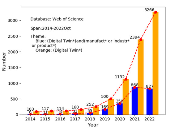 Literature statistics of digital twin in recent years. Note: * represents the operator that contains the word and its extension. For example, product* find records containing product (or products, or production).