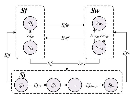 Therefore, the operation status of a single device can be described as inner and outer layers, as shown in Figure 3. The state of the outer layer is S = {Sw, Sf, Sj}. Each element of S has its inner layer. Sw = {Swi, Swb}, Sf = {Sfi, Sfb}, and Sj = {Sj1, Sj2, …, Sjn}.