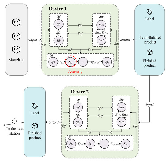 However, state machine transitions are slightly different when an anomaly occurs in one of the devices, or when work is transferred to another device for an urgent task adjustment. In Figure 4, Ejf is triggered when an exception for Sj2 is detected. The state changes to Sfb and outputs “Sj2 job interruption of product on device 1”. When the product is removed from device 1, device 1 triggers Efbi, and the device state changes from Sfb to Sfi. The product is transformed to idle waiting device 2 along with the output label. When the Ewj event is satisfied, device 2 continues the Sj2 job and the subsequent job process according to the device label. Device replacement may be carried out in accordance with the foregoing in the event of an abnormal or emergency adjustment in the subsequent operation. When the work at this station is completed, that is, Sjn is completed, the output is “Product completed at device 2”. Ejw transfers to Swb. When the product is output in device 2, the state transfers to Swi. The product is transferred to the next station with the label.