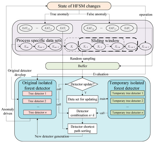 Commonly, a working process consists of multiple processes. Therefore, the dataset is also divided into several process datasets according to the process. In a specific process dataset, a detector, including n trees, is built based on IForest. When the operation state enters the specific process, the specific process dataset is selected, and the original IForest detector, sliding window, and buffer are activated.