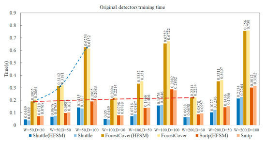 When different training datasets are used, the original training time of ForestCover is significantly higher than that of other datasets. The original training time for Smtp is slightly higher than for the Shuttle dataset. This means that the number of original datasets affects the training time of the original detector.