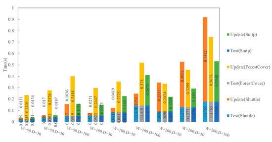 Secondly, we analyzed the top half of the bar chart. In different datasets, when W and D are the same, the average update time of individual datasets varies greatly. This is the result of the proportion of anomalies, data characteristics, and algorithms caused by misjudgment. A too-large proportion of anomalies, continuous anomalies of test data, and excessive misjudgment of the algorithm will force the detector to update, which increases the time and resource consumption of the algorithm update. When W and D increase, the average update time of individual datasets also increases. This is because updated data of the detector comes from the sliding window. The number of detector updates is related to the number of detectors and the update rate.
