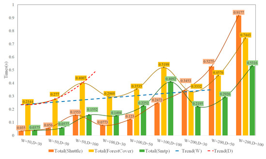 First, we analyzed the bottom half of the bar chart. In different datasets, when W and D are the same, the time spent on the individual dataset is almost the same. This proves that the test time of an individual dataset is only related to the size of W and D and has nothing to do with the data volume. When W and D increase, the test time increases. When W = 100 and D = 100, the test time of a single dataset exceeds 0.1 s. The test time of W = 200 and D = 30 is close to that of W = 100 and D = 50.