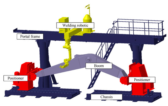 Taking a robot welding workstation of a large equipment manufacturer as an example, this paper introduces DTs based on the aforementioned method. The welding workstation is composed of a welding robot, gantry frame, positioner, and chassis, as shown in Figure 9. Its main task is to weld the boom body of large excavating machinery.