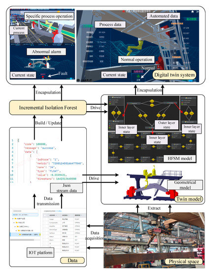 In the manufacturing process, digital twin technology can provide real-time mapping, prediction, and optimization of the physical manufacturing process in the information world. In order to realize the complete expression and accurate identification of and changes in the real-time state of the manufacturing process, a digital twin framework of incremental learning driven by stream data is proposed. Additionally, a novel method of stream data-driven equipment operation state modeling and incremental anomaly detection is proposed based on the digital twin. Firstly, a hierarchical finite state machine (HFSM) for the manufacturing process was proposed to completely express the manufacturing process state. Secondly, the incremental learning detection method driven by stream data was used to detect the anomaly of the job process data, so as to change the job status in real time. Furthermore, the F1 value and time consumption of the proposed algorithm were compared and analyzed using a general dataset. Finally, the method was applied to the practical case development of a welding manufacturer’s digital twin system. The flexibility of the proposed model is calculated by the quantitative method. The results show that the proposed state modeling and anomaly detection method can help the system realize job state mapping and state change quickly, effectively, and flexibly.