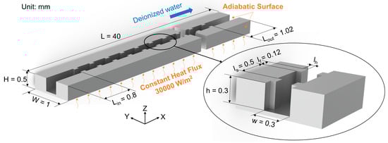 The physical model, shown in Figure 1, was designed according to the results obtained from different scientific research projects undertaken by the authors and the existing studies [20,21,22]. The length, width, and height of the microchannels were set to L = 40 mm, W = 1 mm, and H = 0.5 mm, respectively. The microchannel was divided into an inlet section of Lin = 0.8 mm, a middle section, and an outlet section of Lout = 1.08 mm along the flow direction. In the middle section, fins were created symmetrically on the sidewall. The fin width and spacing were lf = 0.12 mm and ls = 0.5 mm, respectively. The cross-section of the fluid domain was 0.3 × 0.3 mm. The top surface of the fluid domain was closed and did not allow any mass or heat transfer. A constant heat flux density of 30,000 W/m2 was applied to the bottom surface of the solid, and the other walls were thermally insulated. Silicon was selected as the channel solid, and deionized water was used as the fluid. The Re range was set to 0–500.