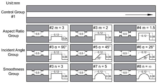 First, we investigated microchannels without internal microstructures as the control group. The aspect ratio of fins is defined as the ratio of the fin width to the fin height and is denoted as “m.” To analyze the effect of fin shape, the fins were marked as #2 (m = 3), #3 (m = 2), and #4 (m = 1.5) with a fixed fin width of 0.12 mm and different fin heights of 0.04, 0.06, and 0.08 mm, respectively. Next, the incident angle of the fins is defined as the angle between the mainstream direction, and the plane of the leading edge of the fins and is denoted as “α.” To investigate the effect of the fin’s leading edge, the fins were marked as #3 (α = 90°), #5 (α = 45°), and #6 (α = 26°). Similarly, the smoothness of fins, denoted as “n”, is defined as the number of edges of a single fin, and to evaluate the effect of the edges and corners, the fins were marked as #3 (n = 3), #7 (n = 5), and #8 (n = ∞).