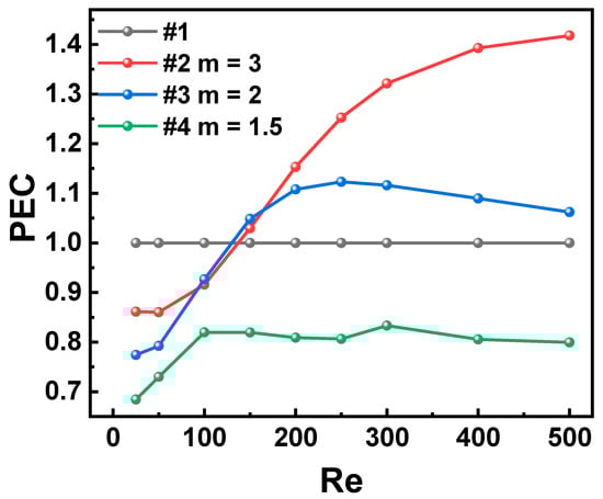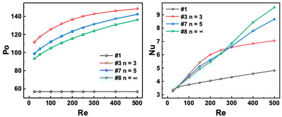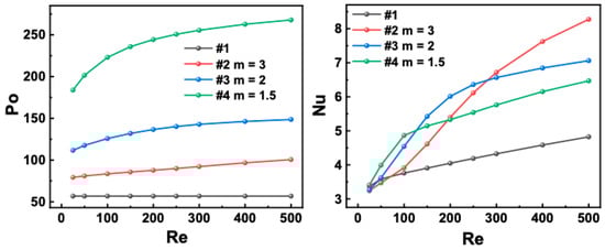 In the analysis, the flow and heat transfer characteristics are determined by Po and Nu, respectively. The comprehensive thermal performance is evaluated by the PEC, which considers both the flow and heat transfer. The calculation formulas are as follows [28,33]: