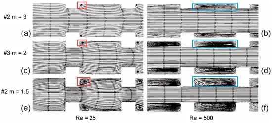 Streamlines in the transverse central section of the fluid with different fin aspect ratios: (a) m = 3, Re = 25; (b) m = 3, Re = 500; (c) m = 2, Re = 25; (d) m = 2, Re = 500; (e) m = 1.5, Re = 25; (f) m = 1.5, Re = 500. The red box indicates the stagnation vortices formed at the trailing edge of the fins at Re = 25, and the blue box indicates the impact vortices formed in the intervals between fins at Re = 500.