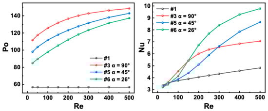 The flow characteristics of the finned microchannels with different incident angles were evaluated in this study. For the microchannels with the same Re, the change in Po due to the fins is positively correlated with the fin incident angle. For example, if the incident angle increases from 26° to 90°, then Po increases by 24.0% at Re = 25 and by 7.6% at Re = 500. This trend is observed, because a larger incident angle results in a more pronounced obstruction of the main flow in the channel by the fins as well as a greater change in the fluid cross-sectional area and flow direction. The aforementioned perturbations result in a higher flow resistance in the microchannels with a higher incident angle.