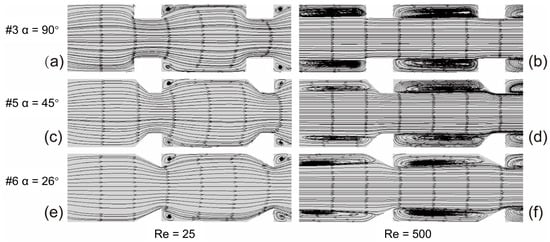 Streamlines in the transverse central section of the fluid with different fin incident angles: (a) α = 90°, Re = 25; (b) α = 90°, Re = 500; (c) α = 45°, Re = 25; (d) α = 45°, Re = 500; (e) α = 26°, Re = 25; (f) α = 26°, Re = 500.