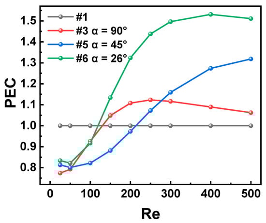 PEC versus Re with different fin incident angles.