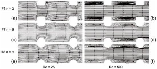Streamlines in the transverse central section of the fluid with different fin smoothness: (a) n = 3, Re = 25; (b) n = 3, Re = 500; (c) n = 5, Re = 25; (d) n = 5, Re = 500; (e) n = ∞, Re = 25; (f) n = ∞, Re = 500.