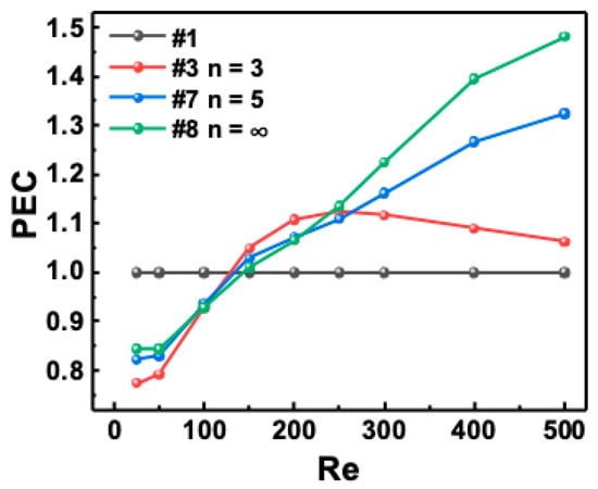 PEC versus Re with different fin aspect ratios.