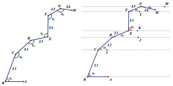The concrete pump truck boom system can be simplified into a turntable and six booms. The turntable has one degree of freedom, which can rotate on the horizontal plane. Each boom has one degree of freedom, which can rotate around the boom (boom 1# can rotate around the turntable through a rotary pair). The entire boom system has seven degrees of freedom. Let each rotation angle be in turn: a, , where a is the rotation angle of the turntable on the horizontal plane (set as 0° forward in the initial state, increasing clockwise rotation), They are, respectively, the rotation angle of the boom relative to the boom (folded to 0° in the initial state, and increased in rotation and expansion, as shown in Figure 1, , , , , , , where the included angle between the boom 3# and the boom 4# is opposite to other included angles), and the boom 1#~6# are on the same plane, so the included angle j between each boom and the horizontal plane (, , , , , ) can be calculated as follows: