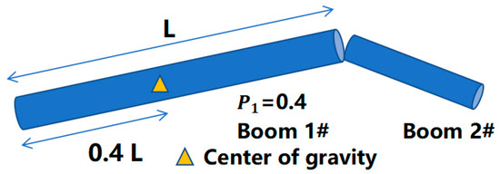The boom section is considered as a box structure. Let the length of the boom be , and the mass of the boom be , and the width and height of the boom be and , and define its center of gravity position coefficient as (), which represents the ratio of the position of the center of gravity to the hinge point of the previous boom and the total length of the boom (as shown in Figure 2).