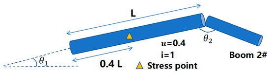 In the same way, we can calculate the internal force of each other boom. The force of each force bearing point is given by the function , where the parameter i represents the boom i#, u represents the division along the boom length, represents the ratio of the distance from the position to the hinge point of the upper boom to the boom length (for example, u = 0.5 represents the midpoint,), and the parameter represents the relative angle between the boom k# and the boom k − 1# (as shown in Figure 4).