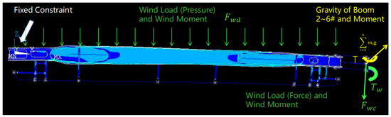 Assume that the force of wind load on the boom i# is , where is the area of the side surface of the boom i#, and is the angle between the direction of the turntable and the wind direction. Similarly, the internal force and moment of hinge point of boom 6# under wind load can be calculated: