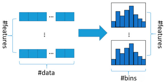 Qi [15] first proposed LightGBM in 2017. LightGBM is a framework for implementing GBDT (gradient boosting decision tree) algorithm, and the main idea of GBDT is to use decision tree iterative training to obtain the optimal model. The traditional GBDT algorithm needs to traverse the entire data multiple times in each iteration. When the data volume is large, it is difficult to put the entire data into memory, and frequent calls to disk for reading and writing will reduce the efficiency. LightGBM uses the Histogram algorithm for optimization (Figure 8). Its basic idea is to discretize the continuous floating-point eigenvalues into k integers, and construct a histogram with a width of k. When traversing the data, the discretized value is used as the index to accumulate statistics in the histogram. After traversing the data once, the histogram accumulates the required statistics, and then traverses to find the optimal partition point according to the discrete value of the histogram. Histogram algorithm does not need additional storage of presorted results, which can significantly reduce memory consumption; Secondly, it can greatly reduce the calculation time. The presorting algorithm needs to calculate a split gain every time it traverses an eigenvalue, while the histogram algorithm only needs to calculate a constant number of times, and the time complexity is optimized from O (#data*#feature) to O (k*#features).