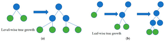 In addition, LightGBM abandoned the level-wise (Figure 9a) decision tree growth strategy used by most GBDT tools and replaced it with the leaf-wise (Figure 9b) algorithm. The purpose of layer-by-layer growth is to facilitate the control of the complexity of the model, prevent the occurrence of overfitting, and facilitate the multi-threaded optimization. However, its efficiency still has room for improvement because it treats the same layer of leaves indiscriminately, and the benefits of searching and splitting some leaves in the same layer are low, which brings a lot of unnecessary expenses. The algorithm of growing by leaves is to find a leaf with the largest split income among all the current leaves. Under the same split times, the fitting accuracy of the strategy of growing by leaves is greater than that of the strategy of growing by layers. In order to prevent the growth of decision trees with excessive depth and overfitting, LightGBM adds the limitation of maximum tree depth [16].